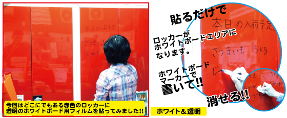 赤色のロッカーにホワイトボード用フィルム(透明)を貼ってみました。