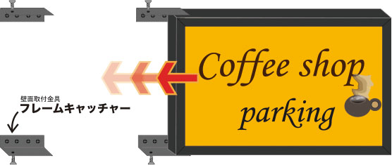 壁面取付金具フレームキャッチャーは看板枠やポスター等を壁面や支柱に取り付ける為の部材です。フレームの内側・外側どちらからでも固定が可能です。